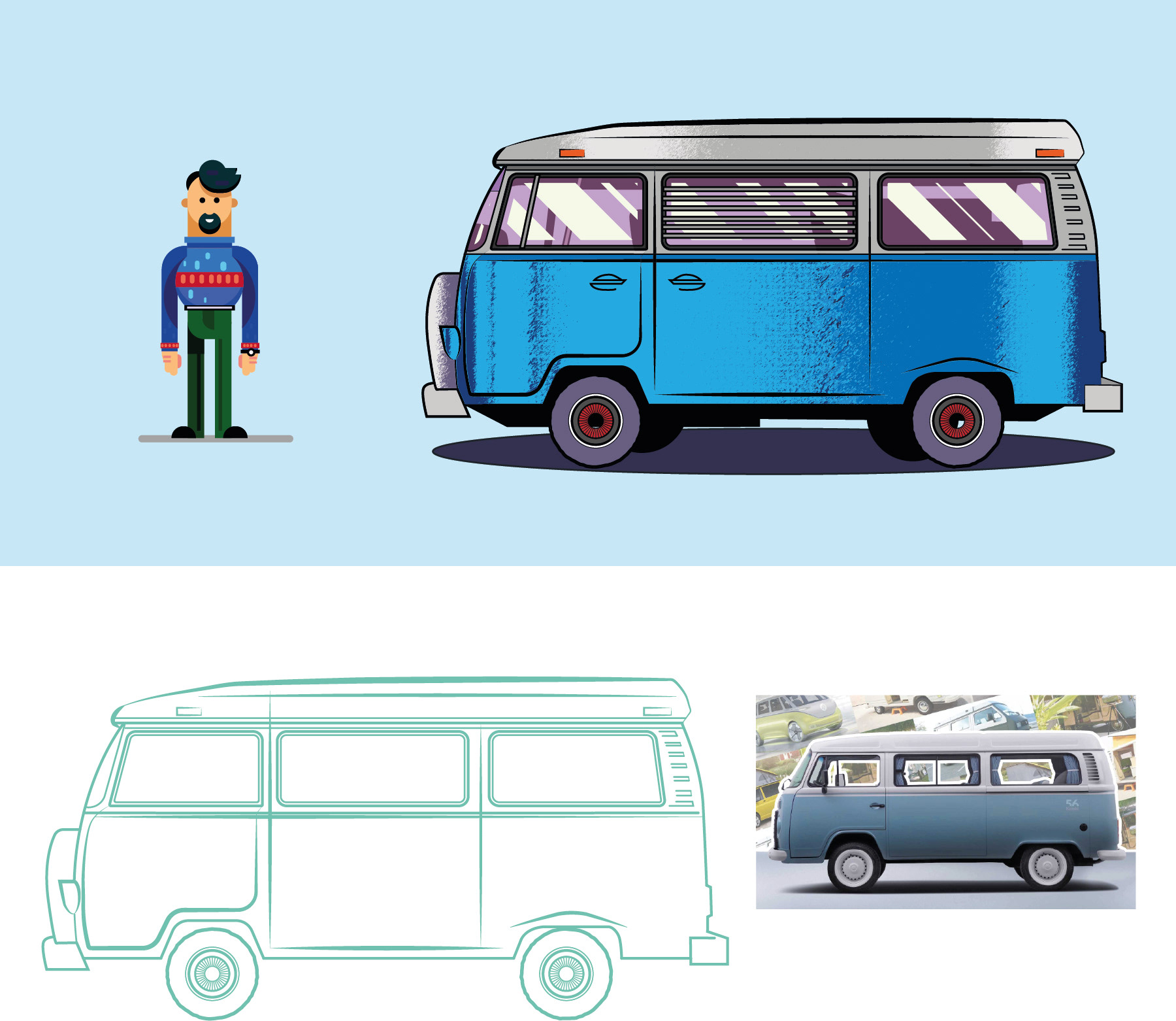 This was a small personal project where I created a vector illustration based on a photo of Bob’s own Volkswagen Type 2, also known as the classic VW Bus. The goal was to preserve the recognizable features of the vehicle while transforming it into a stylized vector artwork with a unique textured finish. The project combined photo-based reference work with digital illustration techniques to achieve a clean yet characterful design that captures the nostalgic charm of the iconic camper.